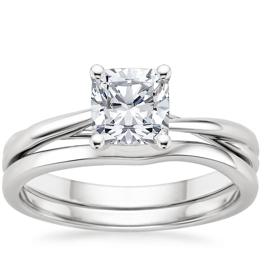 Ribbons of precious metal delicately entwine around the center gem in this artfully sculpted matched set. A beautifully contoured band curves gently along the engagement ring for a classically elegant look. ... Read More