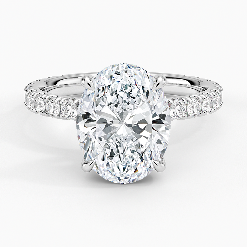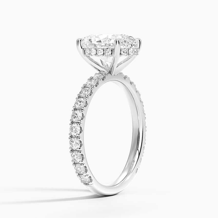 This ready-to-ship ring includes a curated 2 carat oval lab diamond center gem with a diamond band and a raised gallery that allows any wedding band to sit flush for a perfect fit (5/8 side stone ct. tw.).