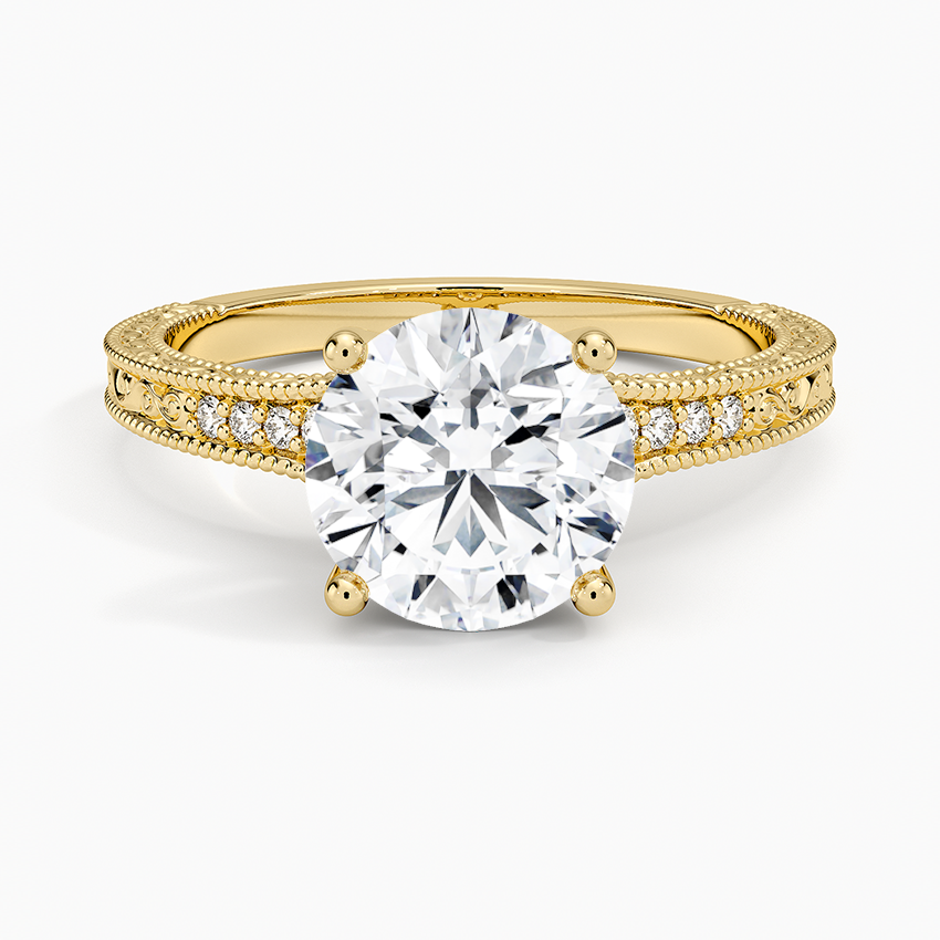 Intricate hand-engraving and subtle borders of milgrain adorn this sensational vintage-inspired ring. Surprise diamonds embellish each side of the gallery and the elegant band is further accented with shimmering diamonds along the gently broadening shoulders (1/10 total carat weight).