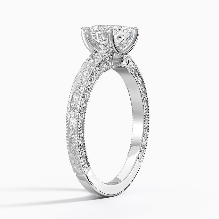 Intricate hand-engraving and subtle borders of milgrain adorn this sensational vintage-inspired ring. The elegant band gently broadens toward the brilliant center gem, producing a stunning effect.