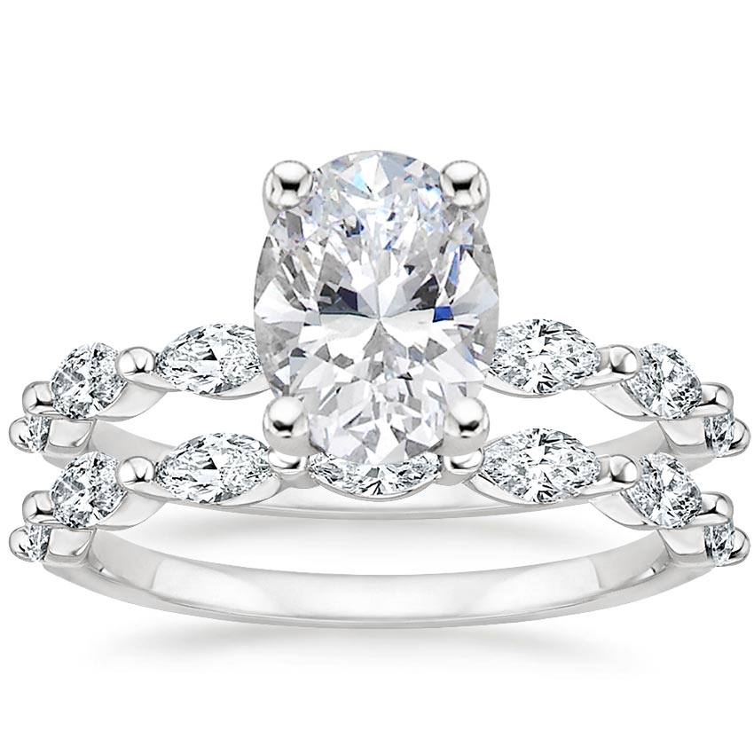 Floating shared prong marquise diamonds elevate a center gem in this light and lustrous bridal set for a spectacular look. ... Read More