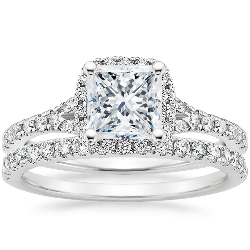 A glittering softened halo of diamonds surrounds the center gem in this matched. A scalloped pav?split-shank paired with a petite diamond band adds a stylish, dazzling effect. ... Read More