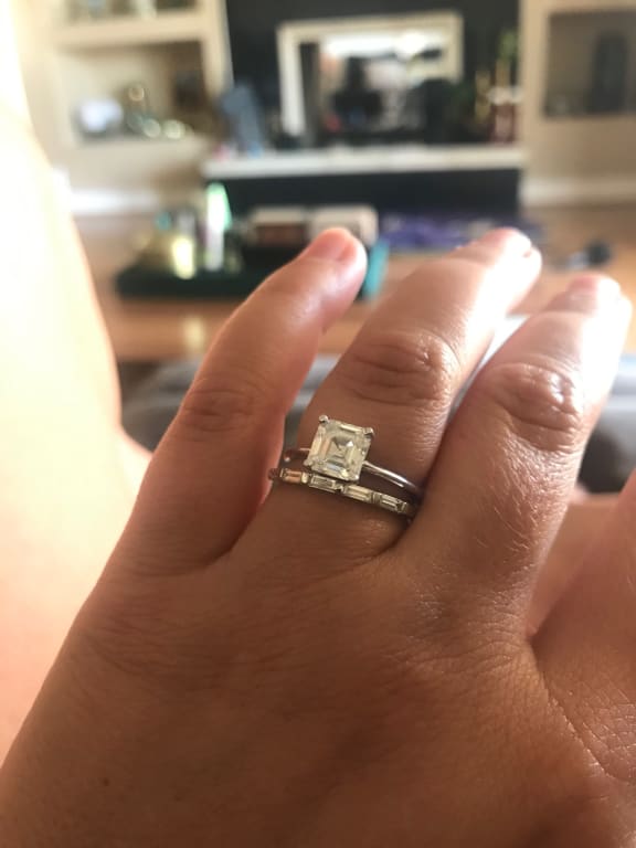 I bought this to accompany my Asscher engagement ring and it pairs perfectly with the step cut design. It is very comfortable to wear, I wasn't sure how I would like the 1/3 cover of diamonds vs a 1/2 cover, but it actually feels really smooth between my fingers (no rough rubbing between my fingers), and the ring doesn't shift too much while wearing. I got a 6.5 and it's perfectly sized. I initially wished it was a little wider but now I love how delicate it looks with really nice light reflection and broad flashes of light when it hits just right!