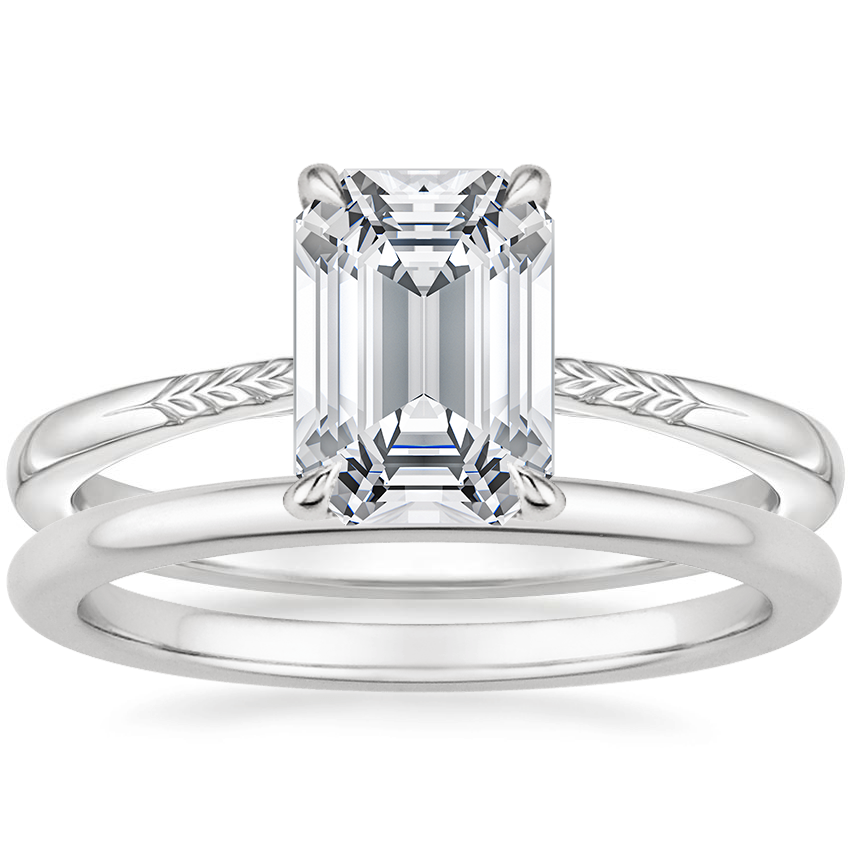 18K White Gold Laurel Engraved Ring with Petite Comfort Fit Wedding Ring with 3.03 Carat Emerald Lab Grown Diamond