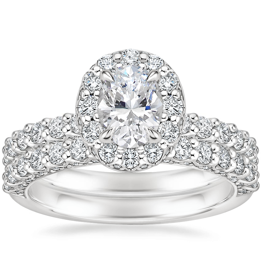 Elegant shared prong diamonds form a stunning halo, surrounding the center gem in a ring of brilliant light. Both bands showcase scalloped pavé diamonds extending half of the way around the band for an eye-catching, chic look. ... Read More