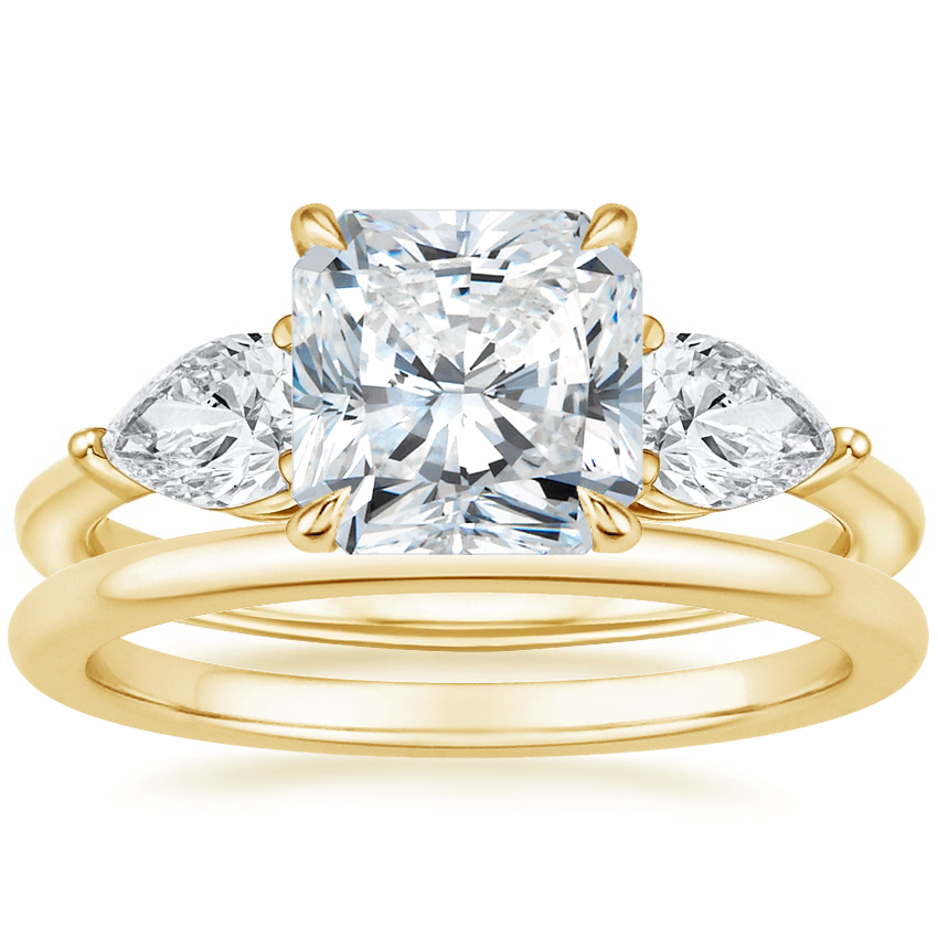 18K Yellow Gold Luxe Opera Three Stone Diamond Ring with Petite Comfort Fit Wedding Ring