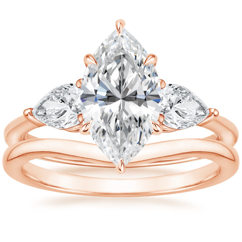 14K Rose Gold Luxe Opera Three Stone Diamond Ring with Petite Curved Wedding Ring
