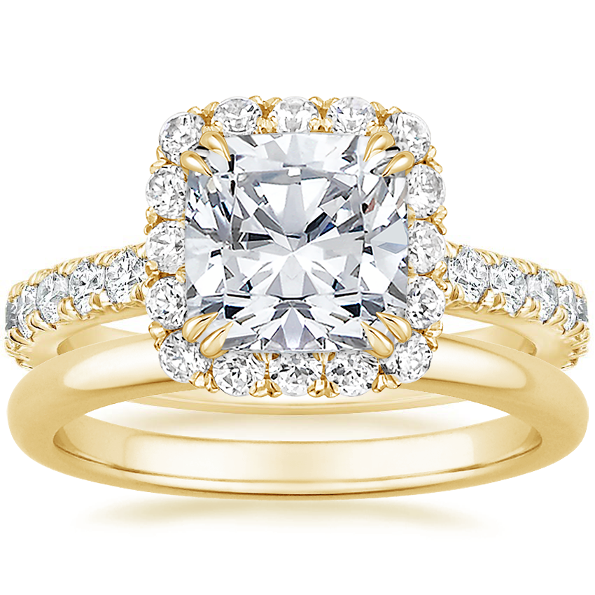 18K Yellow Gold Luxe Sienna Halo Lab Diamond Ring (3/4 ct. tw.) with 2mm Comfort Fit Wedding Ring with 1.69 Carat Cushion Lab Grown Diamond