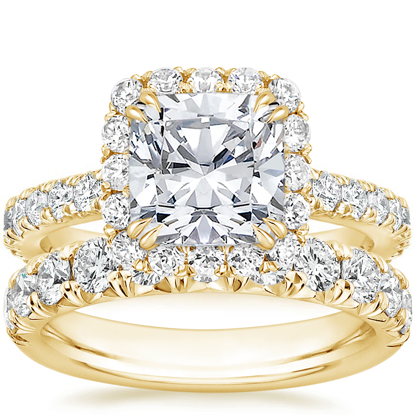 18K Yellow Gold Luxe Sienna Halo Lab Diamond Ring (3/4 ct. tw.) with Ellora Diamond Ring (7/8 ct. tw.) with 1.69 Carat Cushion Lab Grown Diamond
