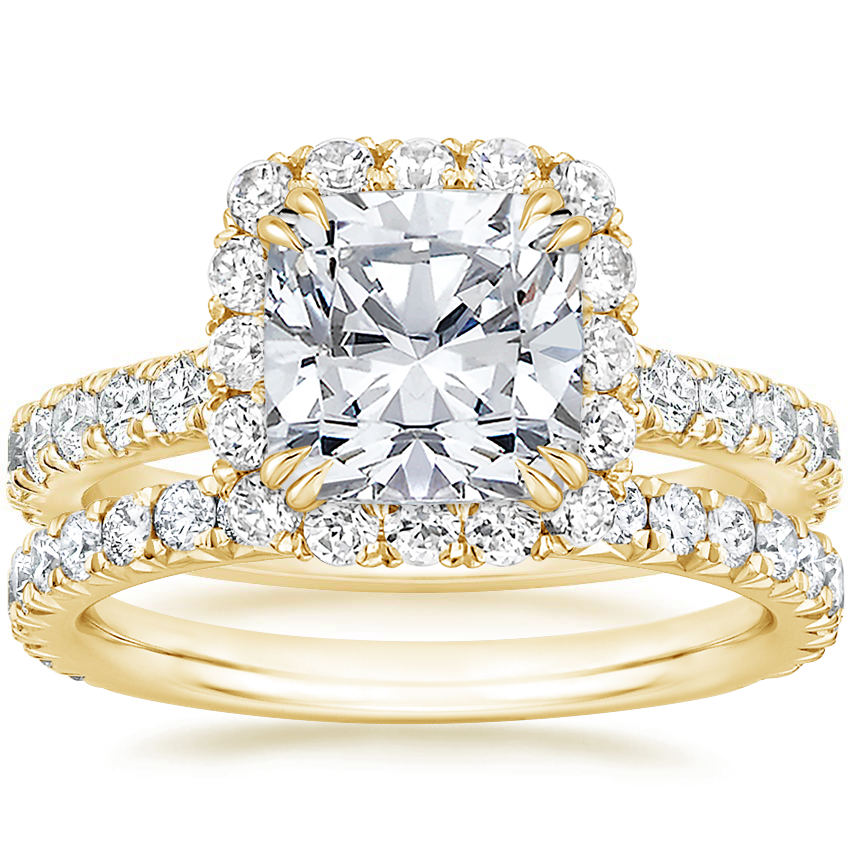 18K Yellow Gold Luxe Sienna Halo Lab Diamond Ring (3/4 ct. tw.) with Luxe Amelie Diamond Ring (1/2 ct. tw.) with 1.69 Carat Cushion Lab Grown Diamond