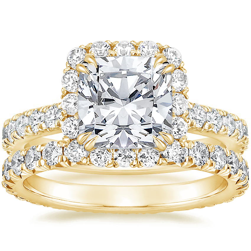 18K Yellow Gold Luxe Sienna Halo Lab Diamond Ring (3/4 ct. tw.) with Sienna Eternity Diamond Ring (7/8 ct. tw.) with 1.69 Carat Cushion Lab Grown Diamond