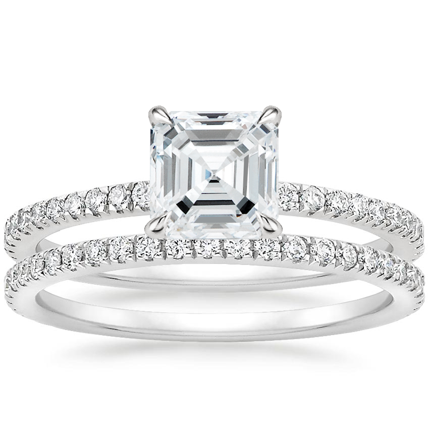 This classic bridal set features sparkling scalloped pavé diamonds that extend three-fourths of the way around the engagement ring and wedding band. A diamond adorned gallery and graceful claw prongs embrace the center gem. ... Read More