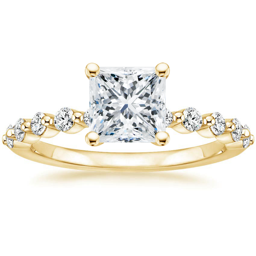 Floating shared prong diamond bands pair effortlessly and elevate the center gem in this light and lustrous bridal set. ... Read More
