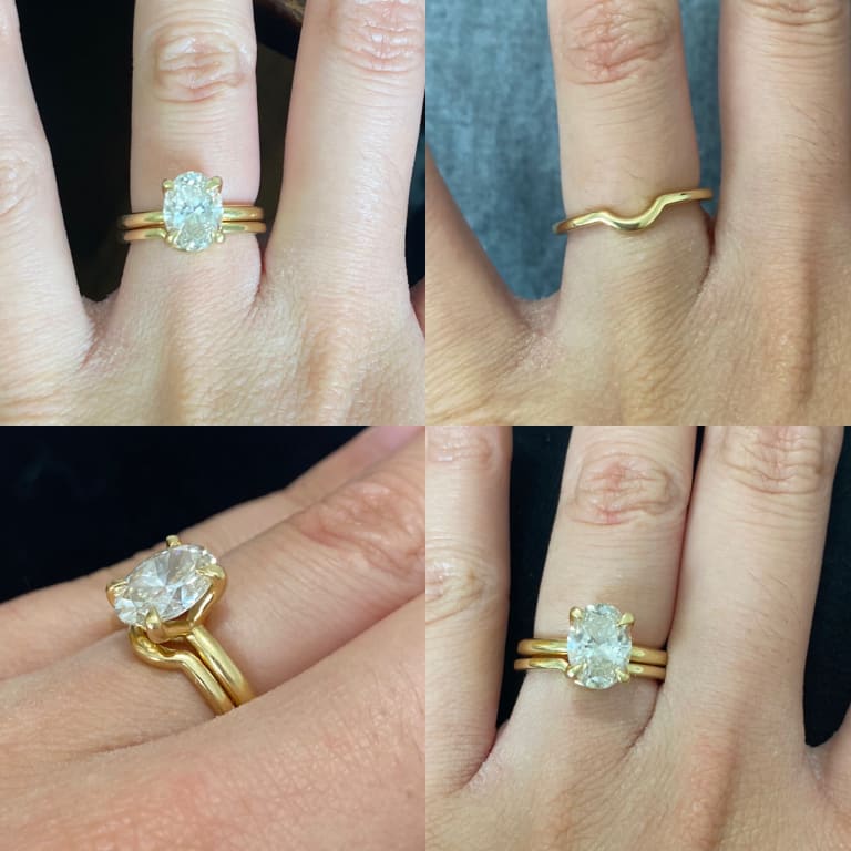 My fiancé surprised me with a Brilliant Earth engagement ring last year (I've been wanting one forever). So when it came time to find a wedding band, I wanted to get mine from Brilliant Earth as well! However, I wanted a simple band to sit flush with my engagement ring but because my diamond isn't raised, I was having trouble finding a simple band. I purchased the half moon nesting ring after a few discussions with the online chat portal (thanks Ashley) and took a chance and have no regrets, it fits perfectly! For reference, my engagement ring is a 2.15ct Elodie in 18k yellow gold.