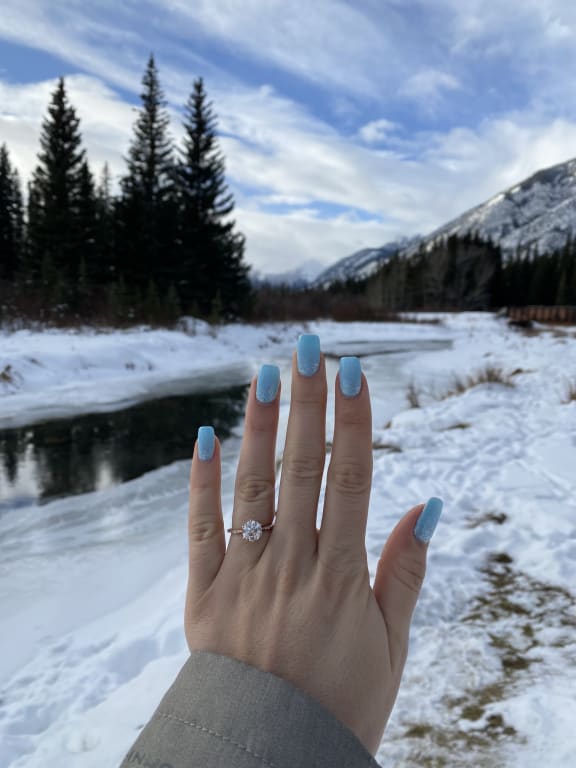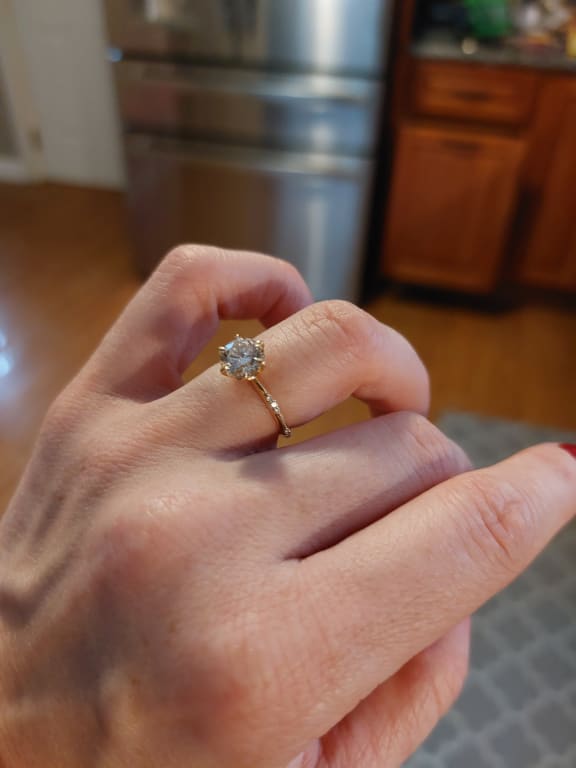 My now fiancé and I tried this ring on in store but they only had the white gold available. We decided on the rose gold but I wasn't able to see it until the day he proposed. The rose gold makes all the beautiful detailing of this band POP! It is such a tiny band but is beautiful. Diamond is 1.78 ...Read More
