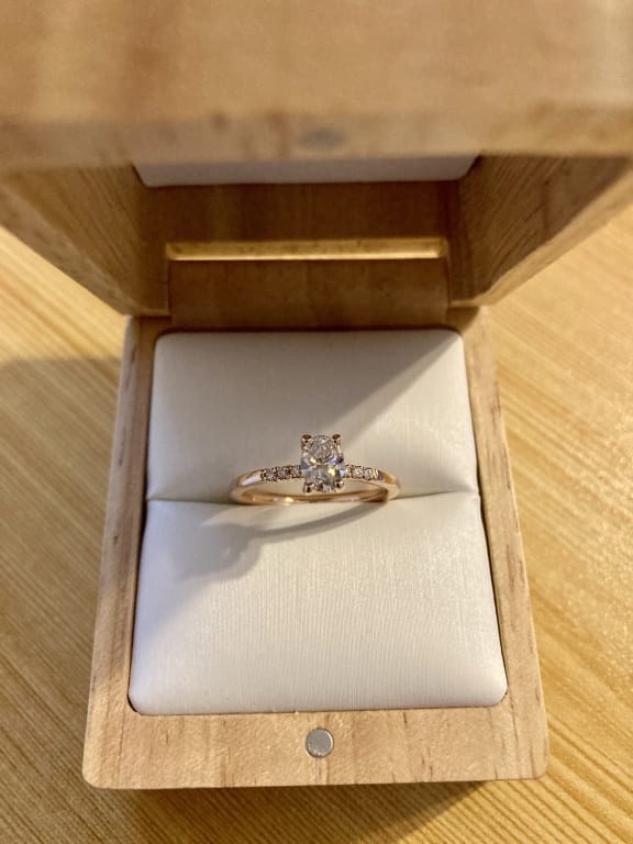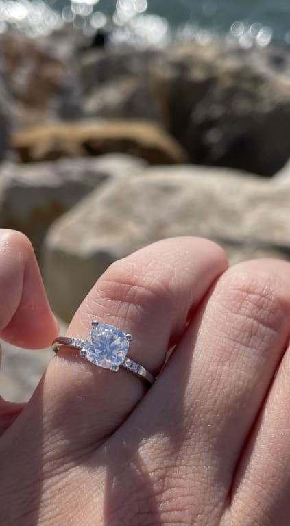 I picked this out as my engagement ring, and I truly couldn't be happier. I hadn't been able to try it on in person before ordering it, which made me nervous, but it's gorgeous. Even prettier than I could have hoped for. I chose rose gold and a 0.5 ct center stone. ...Read More