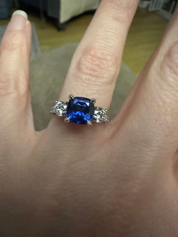 We decided to swap out the middle diamond for a 6mm lab sapphire and it is perfect. My fiancée was concerned that it would be too big as she has small hands and fingers. She was incredibly surprised at how beautiful the ring was and how nice it looks on her. The sapphire with the small diamonds all seem to work well together with nothing looking too large or small. #sweepstakes