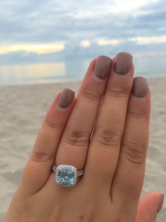 My fiance and I picked out my ring together, and recently got engaged so after months of waiting and staring at it in the box, I can finally wear it! I created my own ring with the platinum Enchant setting (and we ordered the matching band as well for the future!) but instead of a diamond, we decided on a 2 ct aquamarine. I am so beyond in love with my ring. It's everything I wanted and so much more. Don't be fooled by the lack of diamond - the aquamarine sparkles right along with the band and the ring is absolutely gorgeous. I've already gotten so many compliments on it and it's only been a week! So happy with the ease of purchasing and the ring was delivered (or they tried to) exactly on the date that was stated in the confirmation email. I wasn't home that day and had to wait anxiously for the next day. Overall an amazing experience with Brilliant Earth and I can't stop staring at my sparkling aquamarine halo ring! A true testament to our love. We could not be happier.