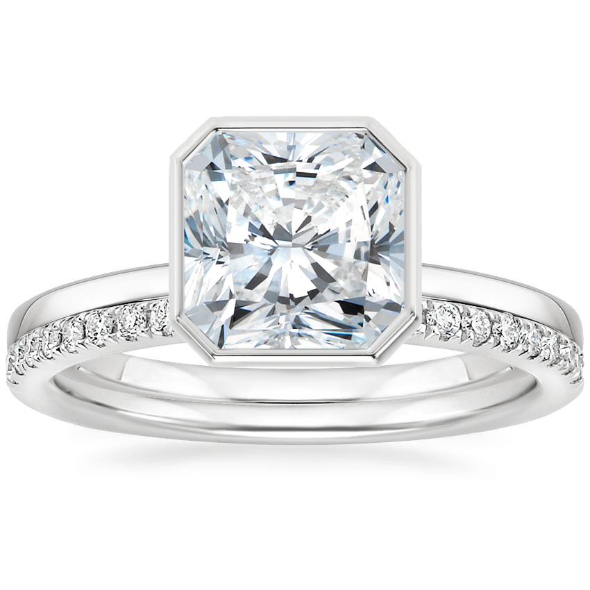 I was specifically looking for a bezel set ring because prongs get caught on things is a pet peeve and I wanted my diamond absolutely secure. This setting gave me the bezel with a simple yet elegant gallery that is very similar to a classic gallery because the sides of the diamond are still exposed! I get a stunning view of my diamond while also having a bezel set that keeps it secure and from catching on clothing! Another plus with this design is that the diamond sits high (it may seem too high at first but you get used to it) and therefore, your wedding band will mostly likely sit flush (depending on which band you choose). I chose a channeled double row pave from another maker and the way it pairs with this E-ring is perfection and everything I wanted. For reference my diamond specs are: 0.95ct Oval, E, VVS1. It sparkles beautifully :)