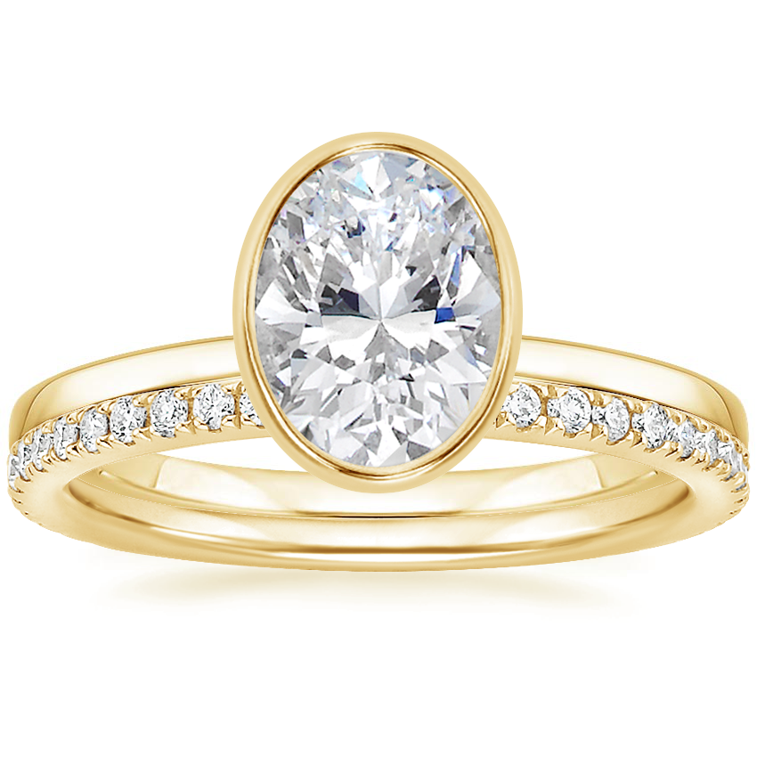 I was specifically looking for a bezel set ring because prongs get caught on things is a pet peeve and I wanted my diamond absolutely secure. This setting gave me the bezel with a simple yet elegant gallery that is very similar to a classic gallery because the sides of the diamond are still exposed! I get a stunning view of my diamond while also having a bezel set that keeps it secure and from catching on clothing! Another plus with this design is that the diamond sits high (it may seem too high at first but you get used to it) and therefore, your wedding band will mostly likely sit flush (depending on which band you choose). I chose a channeled double row pave from another maker and the way it pairs with this E-ring is perfection and everything I wanted. For reference my diamond specs are: 0.95ct Oval, E, VVS1. It sparkles beautifully :)