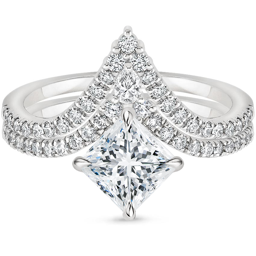 This exquisite bridal set features shimmering pavé diamonds that form a chevron-shaped band above the center gemstone. Claw prongs gracefully support the center gem beneath the engagement ring, creating an artistic look reminiscent of the Art Nouveau era (2/5 total carat weight). ... Read More