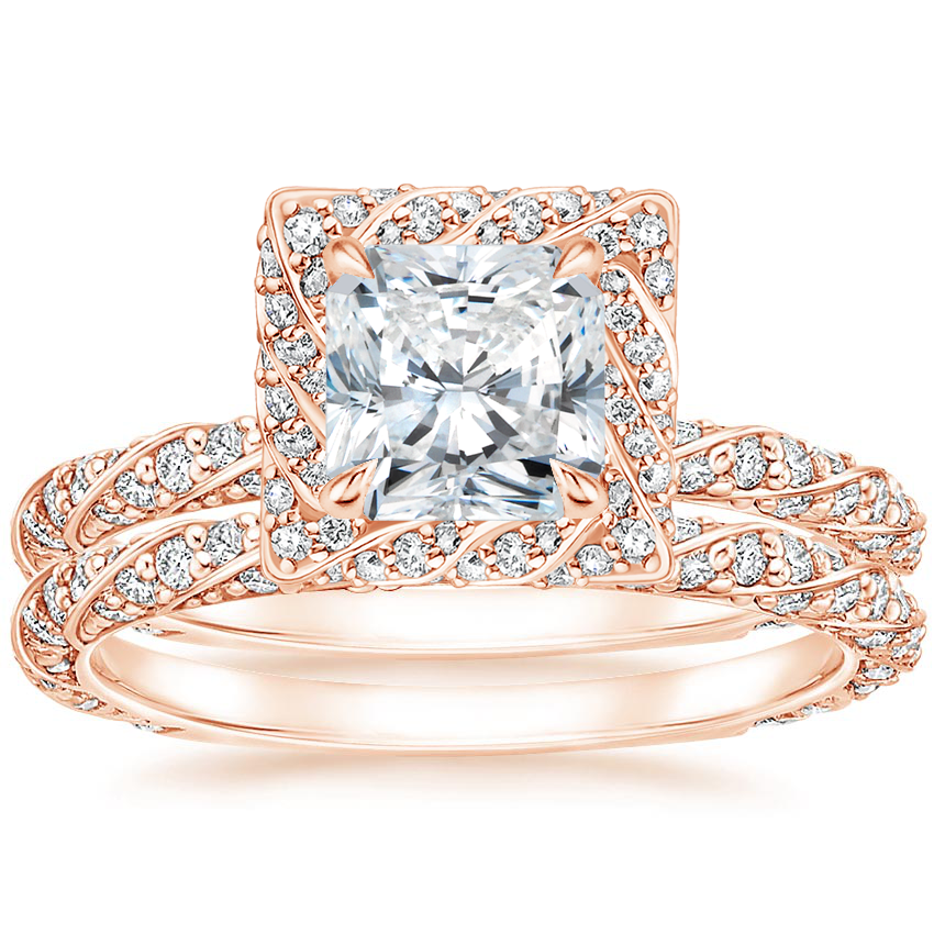 Mesmerizing ribbons of metal and pavé diamonds twist around the bands and center gem of this unique halo matched set. ... Read More