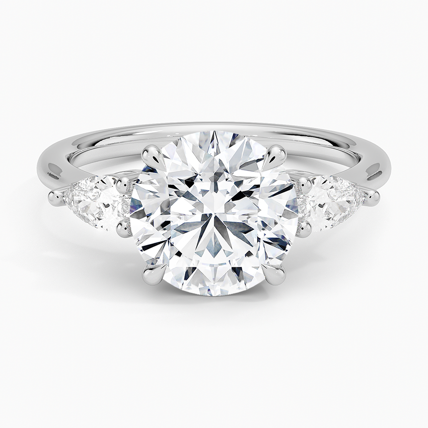 Captivating pear-shaped diamonds brilliantly frame the included 2 carat round certified lab diamond center gem in this classic, ready-to-ship three stone ring. The petite band gently tapers and secures the gems in a basket setting (3/8 side stone ct. tw.).