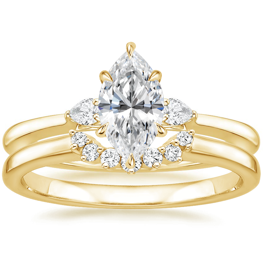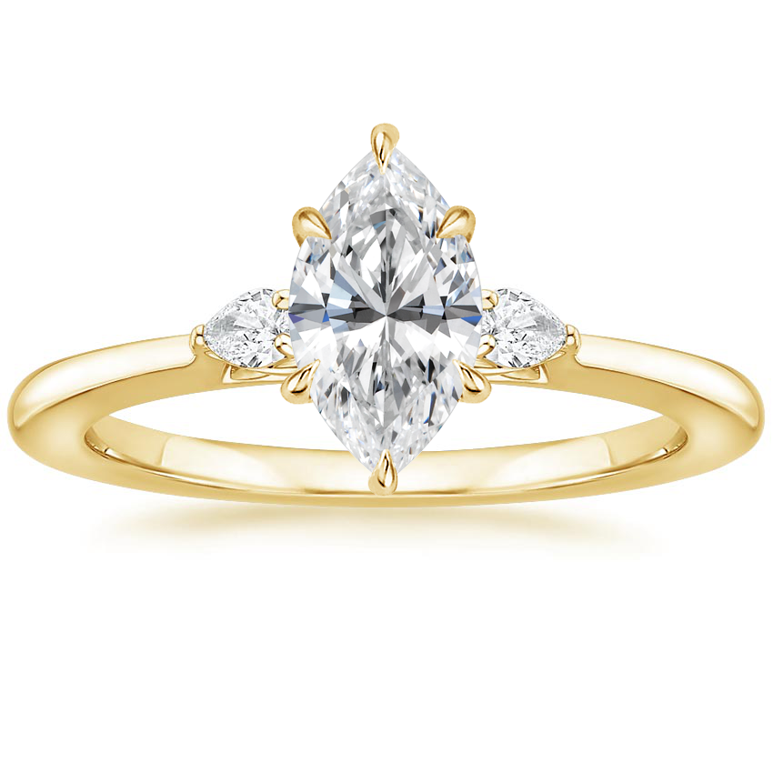 18K Yellow Gold Perfect Fit Three Stone Pear Diamond Ring with Crescent Diamond Ring with 0.75 Carat Marquise Diamond