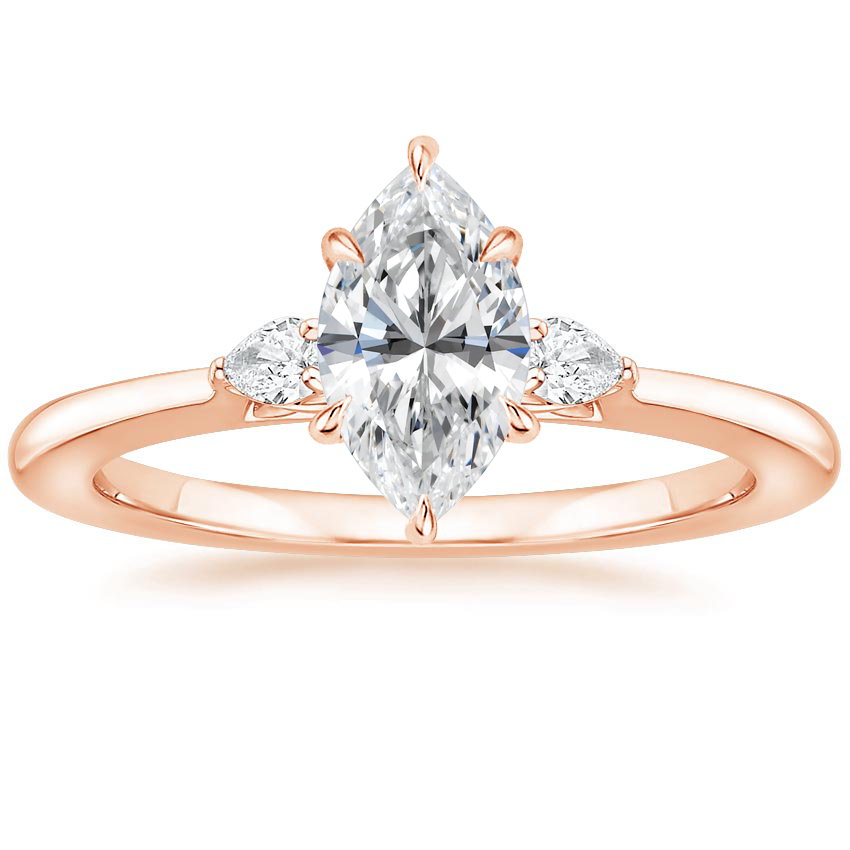 14K Rose Gold Perfect Fit Three Stone Pear Diamond Ring with Crescent Diamond Ring with 0.75 Carat Marquise Diamond