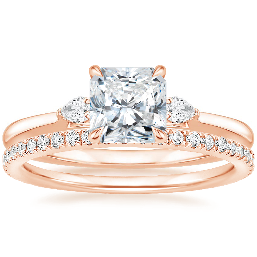 14K Rose Gold Perfect Fit Three Stone Pear Diamond Ring with Luxe Ballad Diamond Ring