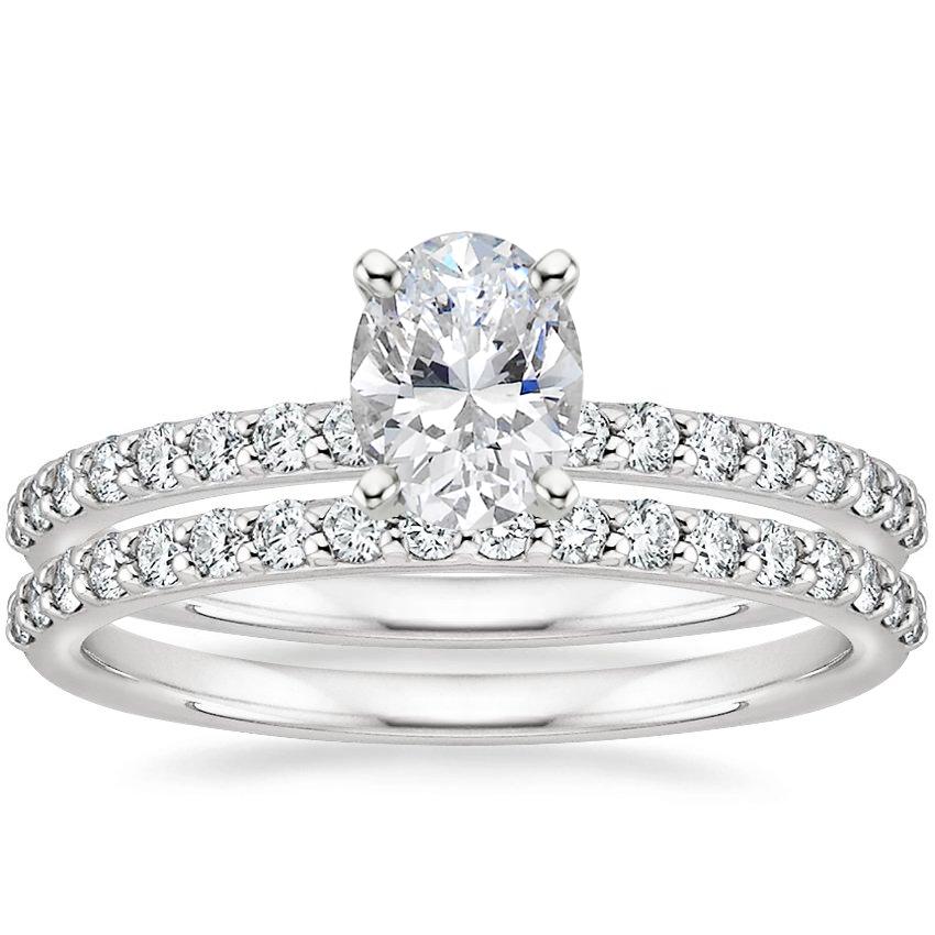 This delicate pairing features shimmering diamonds that extend halfway around both rings. The prong-set center gem appears to float above the dazzling bands. ... Read More