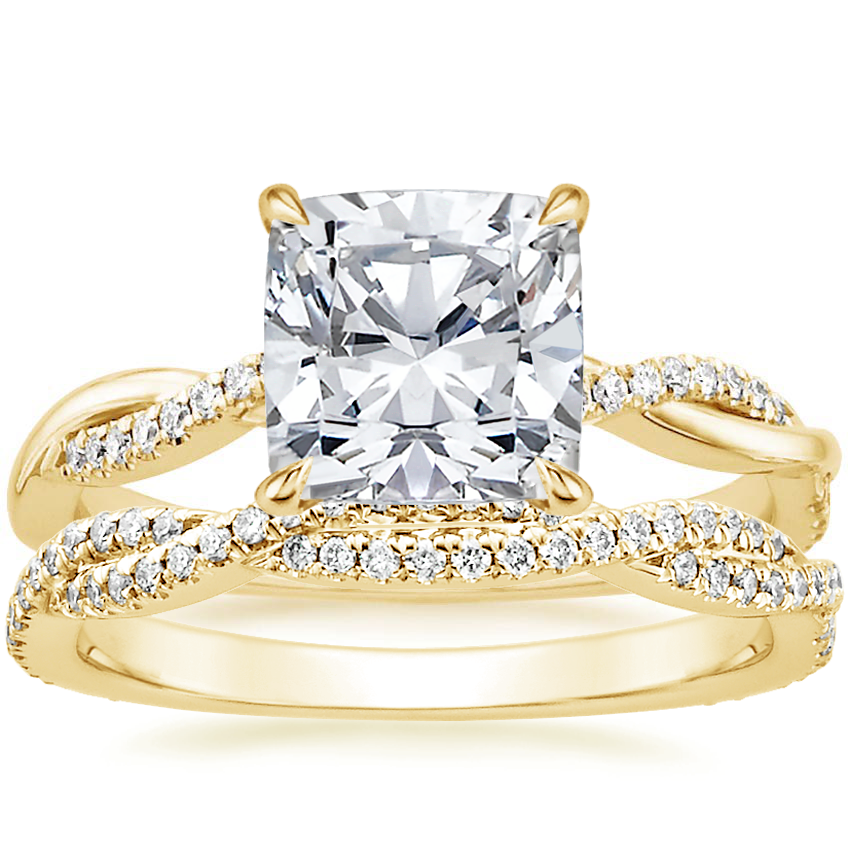 18K Yellow Gold Petite Twisted Vine Lab Diamond Ring (1/8 ct. tw.) with Petite Luxe Twisted Vine Diamond Ring (1/3 ct. tw.) with 2.5 Carat Cushion Lab Grown Diamond