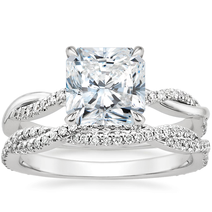 18K White Gold Petite Twisted Vine Diamond Ring (1/8 ct. tw.) with Petite Luxe Twisted Vine Diamond Ring (1/3 ct. tw.) with 1.01 Carat Radiant Diamond