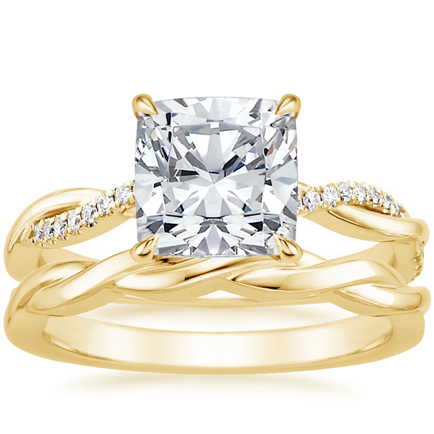 18K Yellow Gold Petite Twisted Vine Lab Diamond Ring (1/8 ct. tw.) with Twisted Vine Ring with 2.5 Carat Cushion Lab Grown Diamond