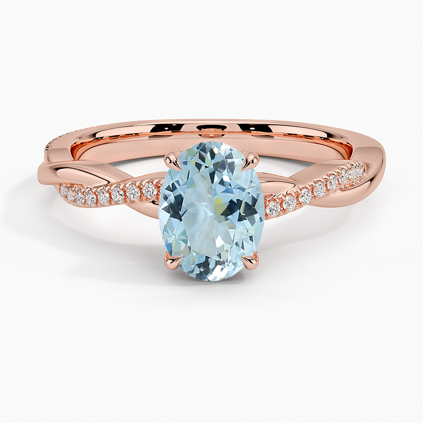 14K Rose Gold Petite Twisted Vine Hidden Halo Pavé Diamond Ring with 7.8x6.1mm Unheated Oval Aquamarine