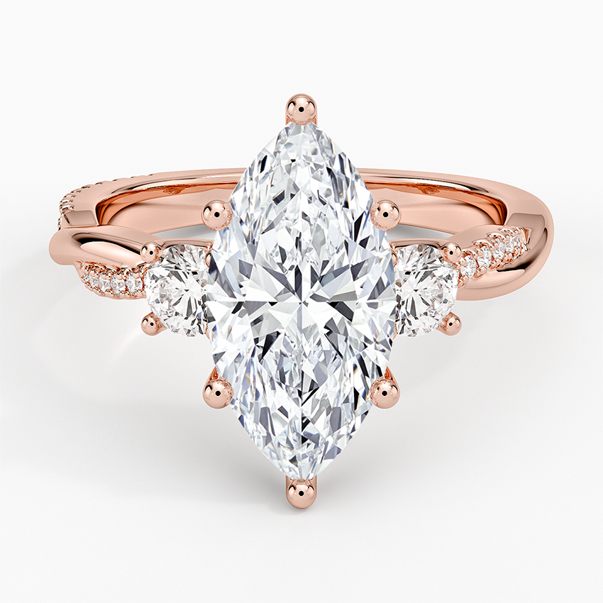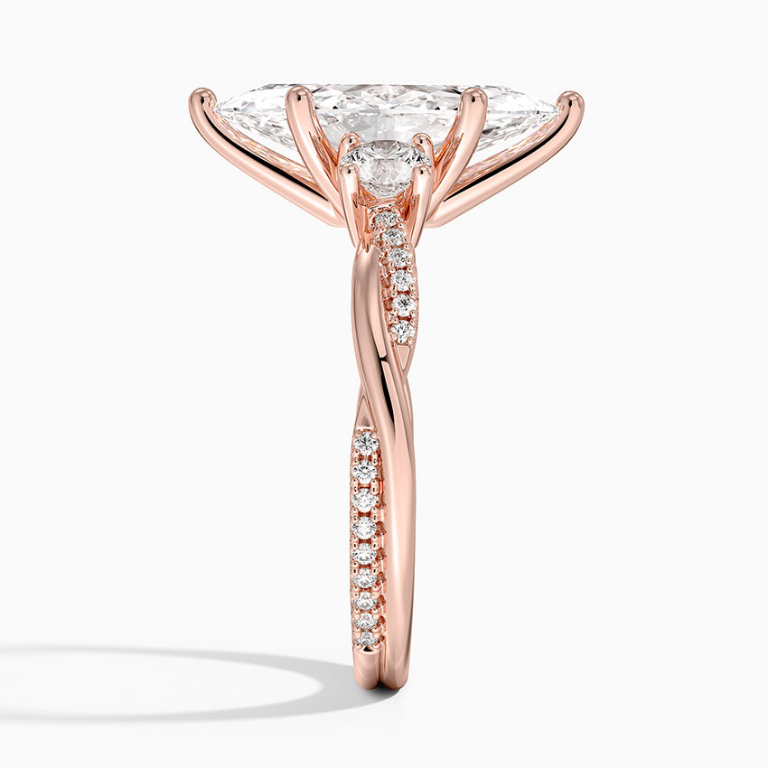 14K Rose Gold Petite Twisted Vine Three Stone Diamond Ring (2/5 ct. tw.) with 2.5 Carat Marquise Diamond
