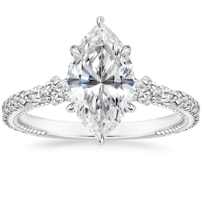The most beautiful ring! My fiancé got it with 1.75 carat oval in platinum, and I am IN LOVE. unique, classic, sexy all in one. The brilliant earth store experience was amazing, I highly recommend. The platinum is a stunning icy look, it looks like a beautiful symphony of diamonds. GET IT!