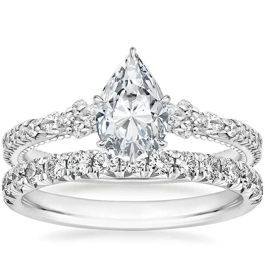 The most beautiful ring! My fiancé got it with 1.75 carat oval in platinum, and I am IN LOVE. unique, classic, sexy all in one. The brilliant earth store experience was amazing, I highly recommend. The platinum is a stunning icy look, it looks like a beautiful symphony of diamonds. GET IT!