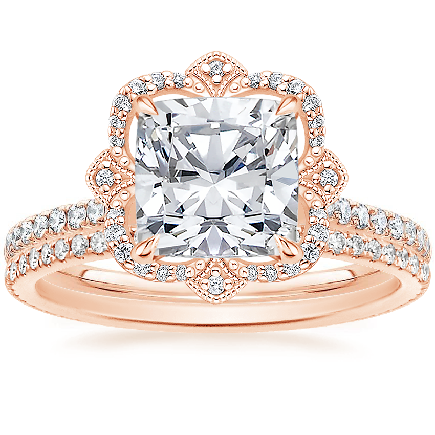 I knew I wanted a rose gold ring in a vintage-inspired setting, and the Reina Halo is absolute perfection! I purchased my ring entirely online (not from a showroom) and I got mine set with a 7mm cushion-cut premium moissanite. While thin and dainty, the pavé band is definitely more durable than I thought it would be. It is so comfortable to wear, and while the gem sits a little higher than I would prefer, I'm sure this is to comfortably accommodate my future wedding band. Overall I had a fantastic experience with customer service, ordering online, and receiving my purchase. I highly recommend Brilliant Earth, their rose gold options, their moissanite gemstones, and the Reina Halo setting!