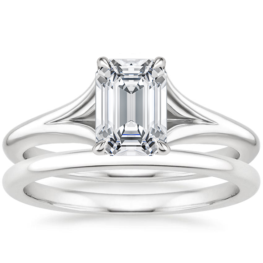 At once feminine and contemporary, the engagement ring divides into graceful ribbons of precious metal that intertwine and embrace the center gemstone, securing it with claw prongs. The petite wedding band features a rounded inside edge for increased comfort. ... Read More