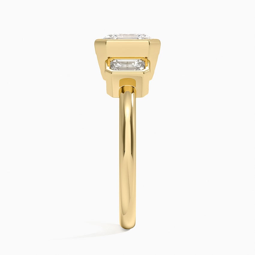 Captivating emerald cut side stones are bezel-set in this chic ring, brilliantly framing the center gem. With a delicate band, this ring evokes classic beauty (1/2 carat total weight).