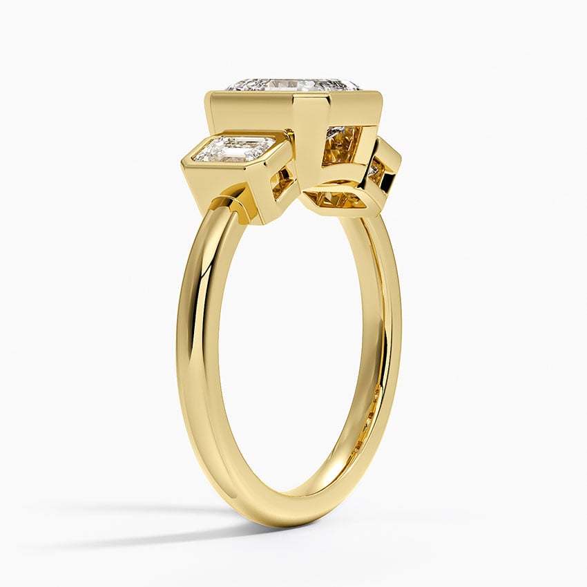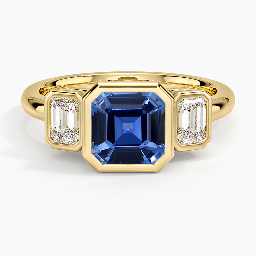 18K Yellow Gold Rhiannon Bezel Three Stone Diamond Ring with 6.6mm Blue Asscher Sapphire