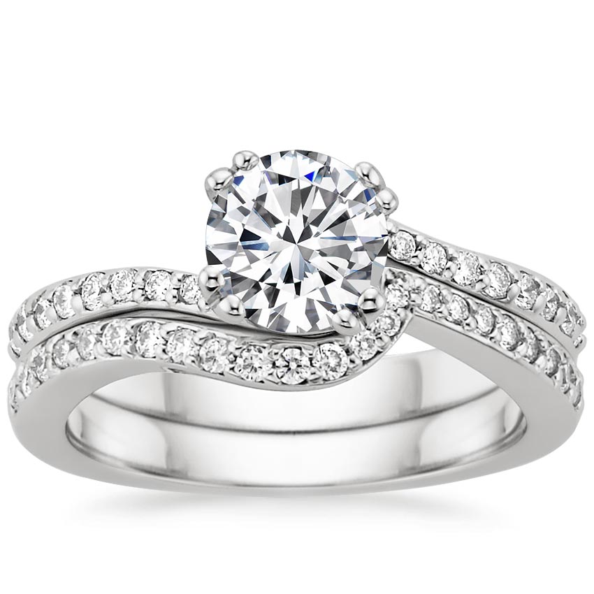 This signature Brilliant Earth matched set features a gorgeous band of diamond accents that gracefully swirl around the prong-set center gem. The contoured matching diamond accented wedding ring sits perfectly flush with the engagement setting. ... Read More