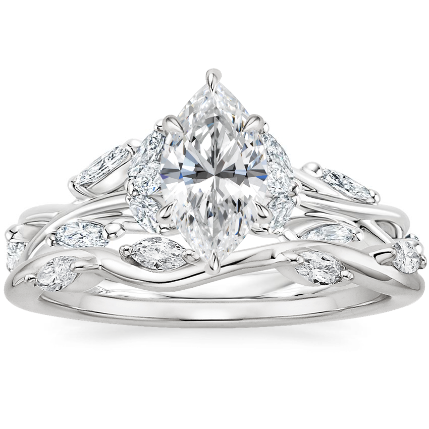 Setting: Secret Garden material: platinum Primary Gemstone: moissanite, marquis cut accent gemstones: 16x lab diamonds I proposed to my fiance with this ring and she loves it! I chose platinum since she has some sensitivity to metals and platinum is the least likely to cause a reaction. The vine design goes around the entire top and sides of the ring, which we like because it carries the theme of the design over most of the body of the ring instead of just around the the main gemstone. Liz is a huge fan of Lord of The Rings, so I figured she would love a design theme that could pass as one of the elven rings of power - the marquis cut with the viney designs certainly achieves that. As a piano player, she has fairly long fingers compared to how wide her hand is, so I figured the Marquis cut would complement her hand shape - she (thankfully for me) agrees! I very much enjoyed the ability to choose the setting, material, and gemstone. As an engineer and maker, it was important to me that I have some role in the design of the ring to make sure that the ring was *perfect* for MY fiance. The tools provided by Brilliant Earth provided enough options that I was happy with the process. Liz said before I proposed (not so subtly) that she doesn't like natural diamonds because they are expensive and some of the history involving the trade. Moissanite is a fantastic material for gemstones. It is sparkly (which she adores like a seagull), affordable, lab made, and was originally discovered in meteorites! There is NO need to have to buy a natural diamond when Brilliant Earth has these beautiful moissanite gemstones! Highly recommended. The accent diamonds are lab diamonds, and add to the detail of the ring. It is not a simple ring, and there is a lot of detail for the wearer to appreciate. A word from Liz: "I love all the small details, and how the moissanite sparkles in the ligh