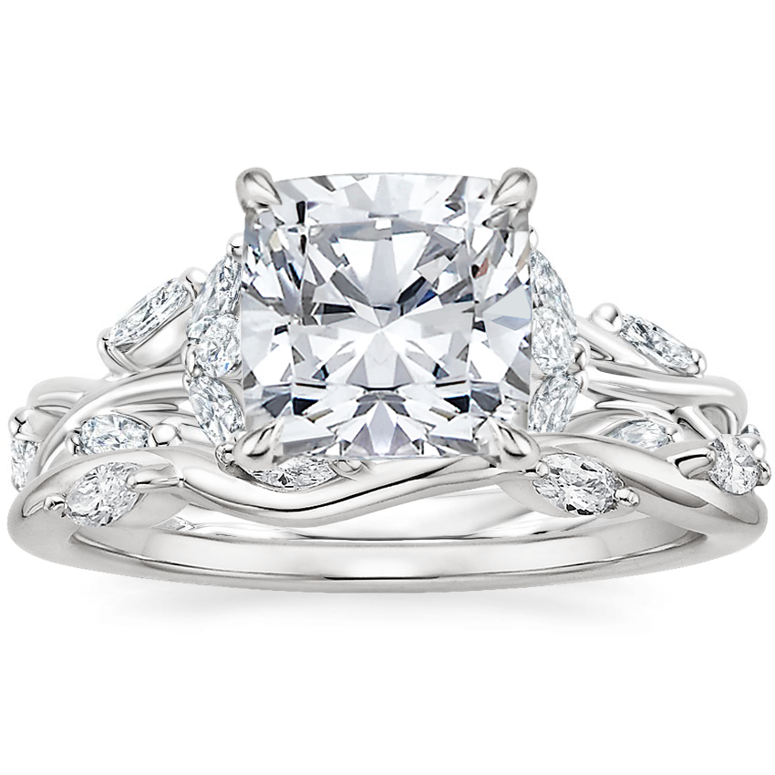 Setting: Secret Garden material: platinum Primary Gemstone: moissanite, marquis cut accent gemstones: 16x lab diamonds I proposed to my fiance with this ring and she loves it! I chose platinum since she has some sensitivity to metals and platinum is the least likely to cause a reaction. The vine design goes around the entire top and sides of the ring, which we like because it carries the theme of the design over most of the body of the ring instead of just around the the main gemstone. Liz is a huge fan of Lord of The Rings, so I figured she would love a design theme that could pass as one of the elven rings of power - the marquis cut with the viney designs certainly achieves that. As a piano player, she has fairly long fingers compared to how wide her hand is, so I figured the Marquis cut would complement her hand shape - she (thankfully for me) agrees! I very much enjoyed the ability to choose the setting, material, and gemstone. As an engineer and maker, it was important to me that I have some role in the design of the ring to make sure that the ring was *perfect* for MY fiance. The tools provided by Brilliant Earth provided enough options that I was happy with the process. Liz said before I proposed (not so subtly) that she doesn't like natural diamonds because they are expensive and some of the history involving the trade. Moissanite is a fantastic material for gemstones. It is sparkly (which she adores like a seagull), affordable, lab made, and was originally discovered in meteorites! There is NO need to have to buy a natural diamond when Brilliant Earth has these beautiful moissanite gemstones! Highly recommended. The accent diamonds are lab diamonds, and add to the detail of the ring. It is not a simple ring, and there is a lot of detail for the wearer to appreciate. A word from Liz: "I love all the small details, and how the moissanite sparkles in the ligh