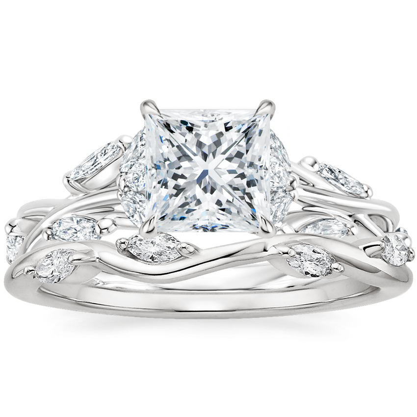 Setting: Secret Garden material: platinum Primary Gemstone: moissanite, marquis cut accent gemstones: 16x lab diamonds I proposed to my fiance with this ring and she loves it! I chose platinum since she has some sensitivity to metals and platinum is the least likely to cause a reaction. The vine design goes around the entire top and sides of the ring, which we like because it carries the theme of the design over most of the body of the ring instead of just around the the main gemstone. Liz is a huge fan of Lord of The Rings, so I figured she would love a design theme that could pass as one of the elven rings of power - the marquis cut with the viney designs certainly achieves that. As a piano player, she has fairly long fingers compared to how wide her hand is, so I figured the Marquis cut would complement her hand shape - she (thankfully for me) agrees! I very much enjoyed the ability to choose the setting, material, and gemstone. As an engineer and maker, it was important to me that I have some role in the design of the ring to make sure that the ring was *perfect* for MY fiance. The tools provided by Brilliant Earth provided enough options that I was happy with the process. Liz said before I proposed (not so subtly) that she doesn't like natural diamonds because they are expensive and some of the history involving the trade. Moissanite is a fantastic material for gemstones. It is sparkly (which she adores like a seagull), affordable, lab made, and was originally discovered in meteorites! There is NO need to have to buy a natural diamond when Brilliant Earth has these beautiful moissanite gemstones! Highly recommended. The accent diamonds are lab diamonds, and add to the detail of the ring. It is not a simple ring, and there is a lot of detail for the wearer to appreciate. A word from Liz: "I love all the small details, and how the moissanite sparkles in the ligh