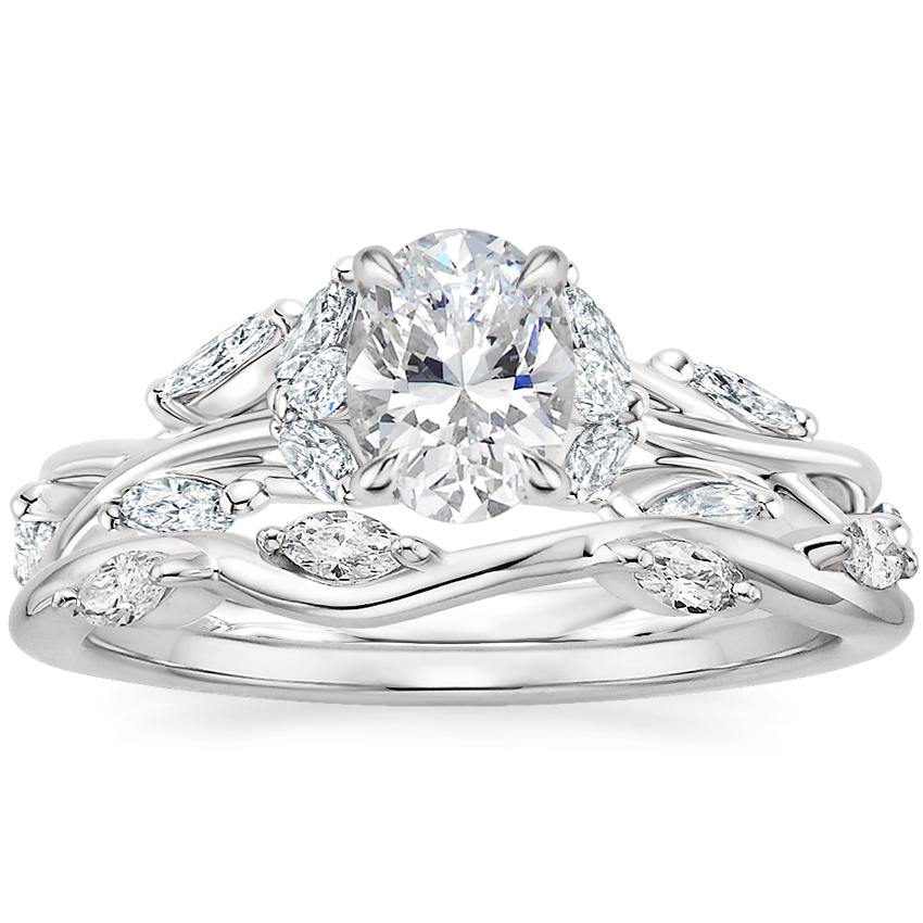 Setting: Secret Garden material: platinum Primary Gemstone: moissanite, marquis cut accent gemstones: 16x lab diamonds I proposed to my fiance with this ring and she loves it! I chose platinum since she has some sensitivity to metals and platinum is the least likely to cause a reaction. The vine design goes around the entire top and sides of the ring, which we like because it carries the theme of the design over most of the body of the ring instead of just around the the main gemstone. Liz is a huge fan of Lord of The Rings, so I figured she would love a design theme that could pass as one of the elven rings of power - the marquis cut with the viney designs certainly achieves that. As a piano player, she has fairly long fingers compared to how wide her hand is, so I figured the Marquis cut would complement her hand shape - she (thankfully for me) agrees! I very much enjoyed the ability to choose the setting, material, and gemstone. As an engineer and maker, it was important to me that I have some role in the design of the ring to make sure that the ring was *perfect* for MY fiance. The tools provided by Brilliant Earth provided enough options that I was happy with the process. Liz said before I proposed (not so subtly) that she doesn't like natural diamonds because they are expensive and some of the history involving the trade. Moissanite is a fantastic material for gemstones. It is sparkly (which she adores like a seagull), affordable, lab made, and was originally discovered in meteorites! There is NO need to have to buy a natural diamond when Brilliant Earth has these beautiful moissanite gemstones! Highly recommended. The accent diamonds are lab diamonds, and add to the detail of the ring. It is not a simple ring, and there is a lot of detail for the wearer to appreciate. A word from Liz: "I love all the small details, and how the moissanite sparkles in the ligh