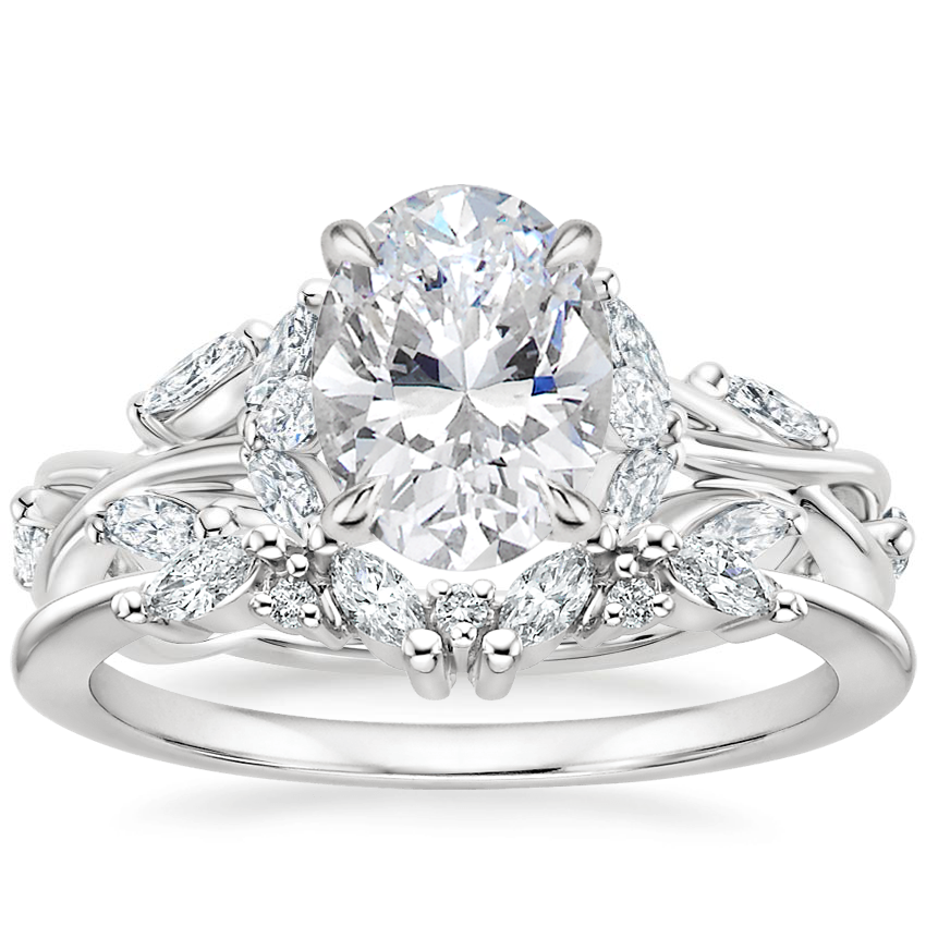 Setting: Secret Garden material: platinum Primary Gemstone: moissanite, marquis cut accent gemstones: 16x lab diamonds I proposed to my fiance with this ring and she loves it! I chose platinum since she has some sensitivity to metals and platinum is the least likely to cause a reaction. The vine design goes around the entire top and sides of the ring, which we like because it carries the theme of the design over most of the body of the ring instead of just around the the main gemstone. Liz is a huge fan of Lord of The Rings, so I figured she would love a design theme that could pass as one of the elven rings of power - the marquis cut with the viney designs certainly achieves that. As a piano player, she has fairly long fingers compared to how wide her hand is, so I figured the Marquis cut would complement her hand shape - she (thankfully for me) agrees! I very much enjoyed the ability to choose the setting, material, and gemstone. As an engineer and maker, it was important to me that I have some role in the design of the ring to make sure that the ring was *perfect* for MY fiance. The tools provided by Brilliant Earth provided enough options that I was happy with the process. Liz said before I proposed (not so subtly) that she doesn't like natural diamonds because they are expensive and some of the history involving the trade. Moissanite is a fantastic material for gemstones. It is sparkly (which she adores like a seagull), affordable, lab made, and was originally discovered in meteorites! There is NO need to have to buy a natural diamond when Brilliant Earth has these beautiful moissanite gemstones! Highly recommended. The accent diamonds are lab diamonds, and add to the detail of the ring. It is not a simple ring, and there is a lot of detail for the wearer to appreciate. A word from Liz: "I love all the small details, and how the moissanite sparkles in the ligh