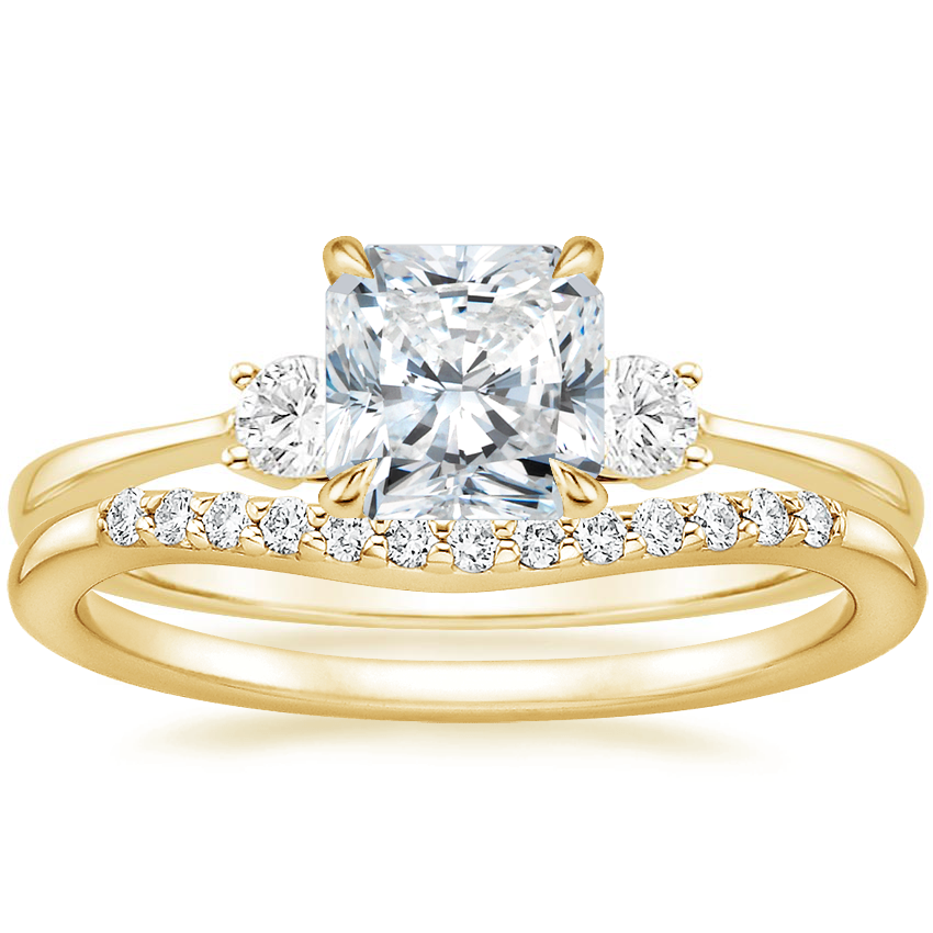 A classic three stone ring is complemented by a plain metal curved band in this modern yet timeless bridal set (1/5 total carat weight). ... Read More