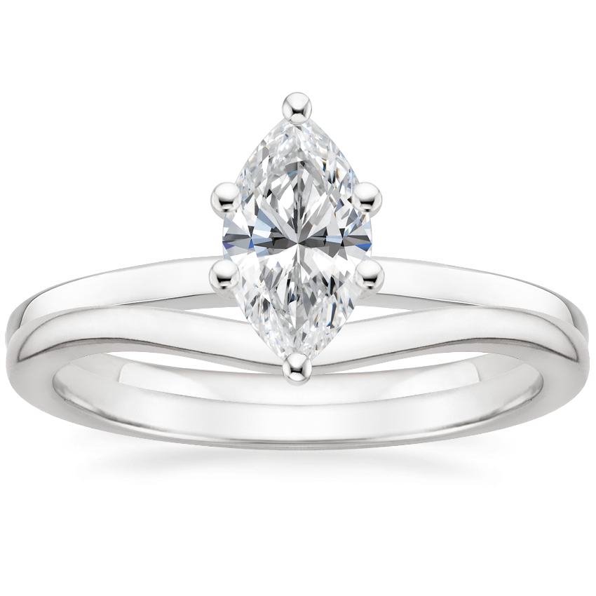 18K White Gold Six Prong Hidden Halo Diamond Ring with Petite Curved Wedding Ring